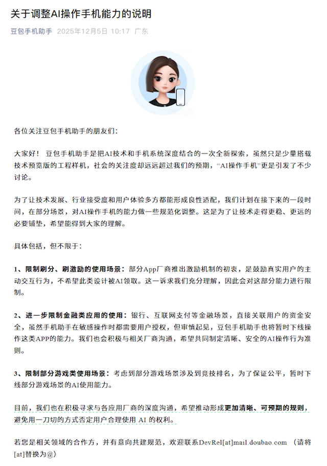 为了让技术发展、行业接受度和用户体验多方都能形成良性适配,我们计划在接下来的一段时间,在部分场景,对AI操作手机的能力做一些规范化调整。这是为了让技术走得更稳、更远的必要铺垫,希望能得到大家的理解。