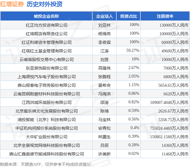 本站消息,根据天眼查APP显示,红塔证券(601236.SH)新增一起对外投资事件,被投资公司为东亚装饰股份有限公司,法定代表人高建伟,投资占比为2.67%。该公司从事建筑装饰、装修和其他建筑业,注册资本为7000万人民币。目前点石策略,红塔证券共存在对外投资16项,详见下表: