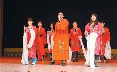 r马天宇自己还参与剧本创作。他帮学生一个词一个词地“抠”,寻找“贬官”“三圣母”等中国古典文化词汇的最佳法语翻译;帮学生编排法语版戏剧《琵琶行》时,他也身着青衫、共同上台,化作风度翩翩的“白居易”……